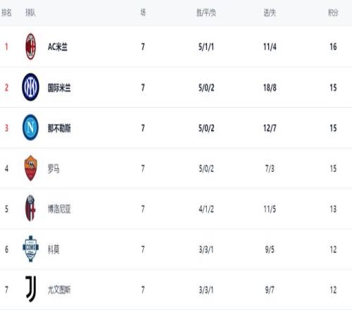 在意甲积分榜,AC米兰的战绩是5胜1平1负,拿到16分,排名榜首。而国际米兰的战绩是5胜2负,15个积分,排名第2。那不勒斯和罗马也都是15个积分,净胜球不如国际米兰,排名第3和第4名。博洛尼亚以13分排名第5。科莫和尤文图斯都是12个积分,排名第6和第7。亚特兰大只拿到11分,排名第8。至于拉齐奥,2胜2平3负,只拿到8分,排名第11。