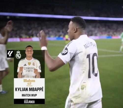 西甲第10轮国家德比,皇家马德里主场2-1击败巴塞罗那,此役打入一球的姆巴佩当选西甲官方全场最佳球员。
