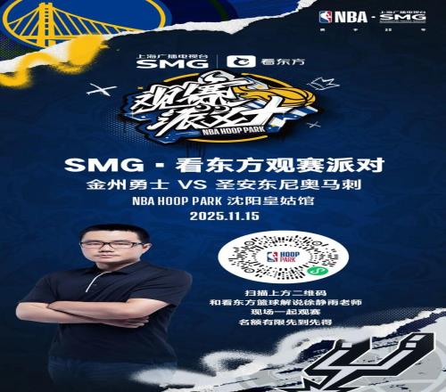 本周六,NBA杯小组赛,马刺主场迎战勇士,文班亚马与库里将上演新老球星巅峰对决!SMG看东方邀请在沈阳的老铁们,一起来观赛派对嗨起来!