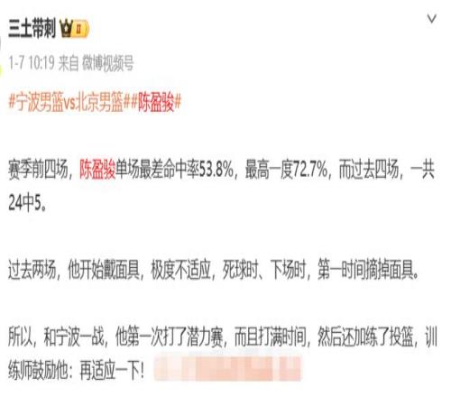 最近这段时间,陈盈骏一直饱受鼻骨骨折伤情的困扰,缺席了3轮比赛,1月3日打广厦才匆匆复出,为了防止比赛再次出现伤情,陈盈骏需要佩戴面具作战,一定程度上影响到他的投篮和传球视线,最近几场比赛,陈盈骏的投篮状态一直不佳,打广厦二番战,仅得5分,上一轮打宁波也仅4中1得到4分,并且还因为状态不佳主动参加了潜力赛加练。