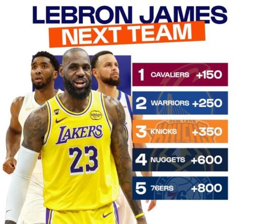 詹姆斯最新下家赔率出炉:骑士居首勇士第二尼克斯掘金进前五