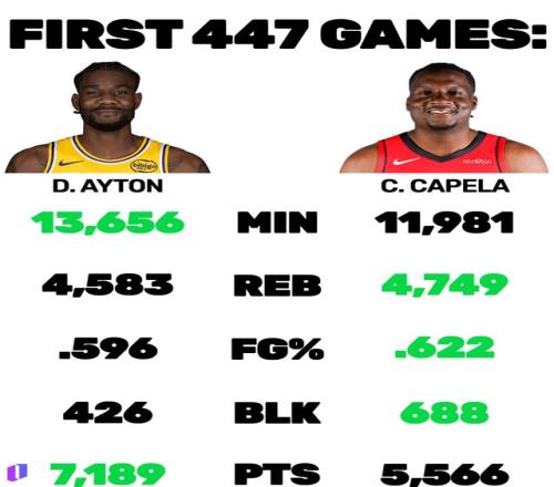 有球迷晒出了两人生涯前447场比赛的总数据对比,艾顿上场时间(13656分钟)和得分(7189分)高于卡佩拉,但篮板、投篮命中率和盖帽都明显低于对方。
