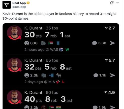 凭借这样的表现,杜兰特已经连续三场轰下30+得分表现,分别是30分、32分和40分,三场合砍102分,让37岁155天的杜兰特成为火箭队史创造这一壮举最老的球员。