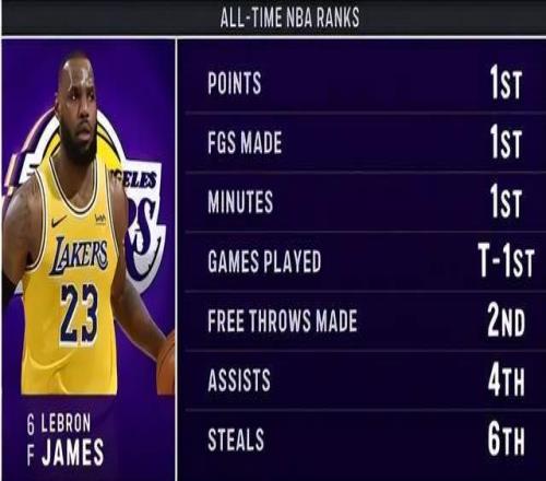 1611场!恭喜詹姆斯,坐拥6项第1,史无前例,仍有一纪录等他打破